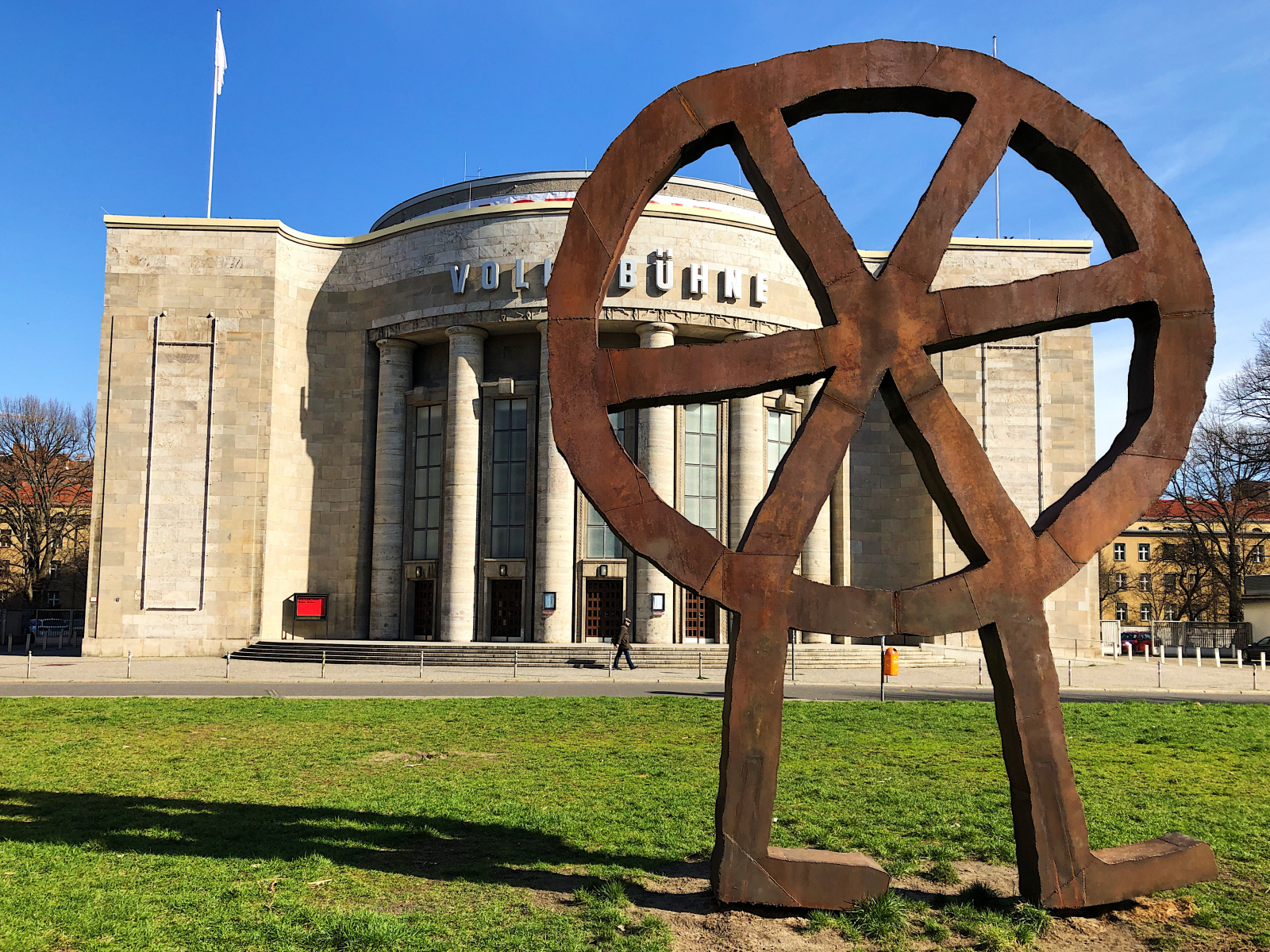 Die Performance „Im Fadenkreuz“ von Novoflot findet im öffentlichen Raum auf dem Platz vor der Volksbühne statt.